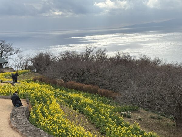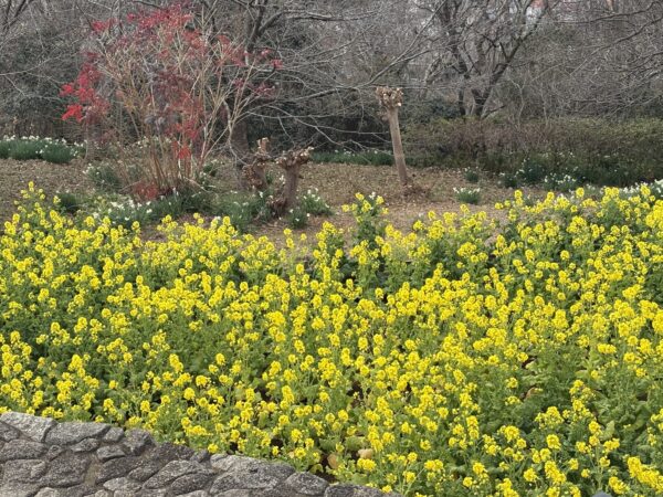 菜の花は満開で里桜やスイセンそこに雪も舞い散り綺麗でした