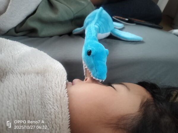 翌朝お土産に買ったフタバスズリュウに噛まれていた娘でした